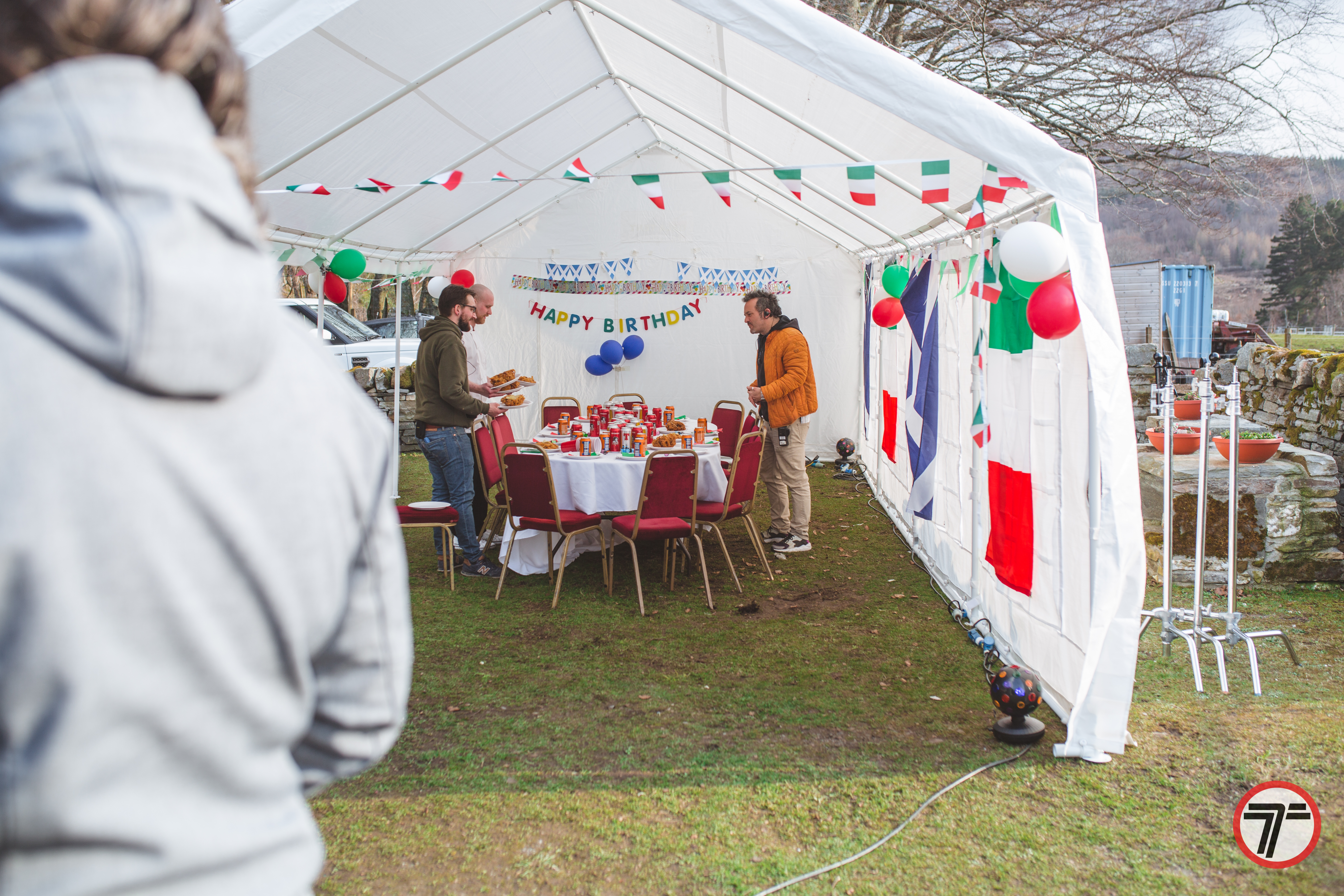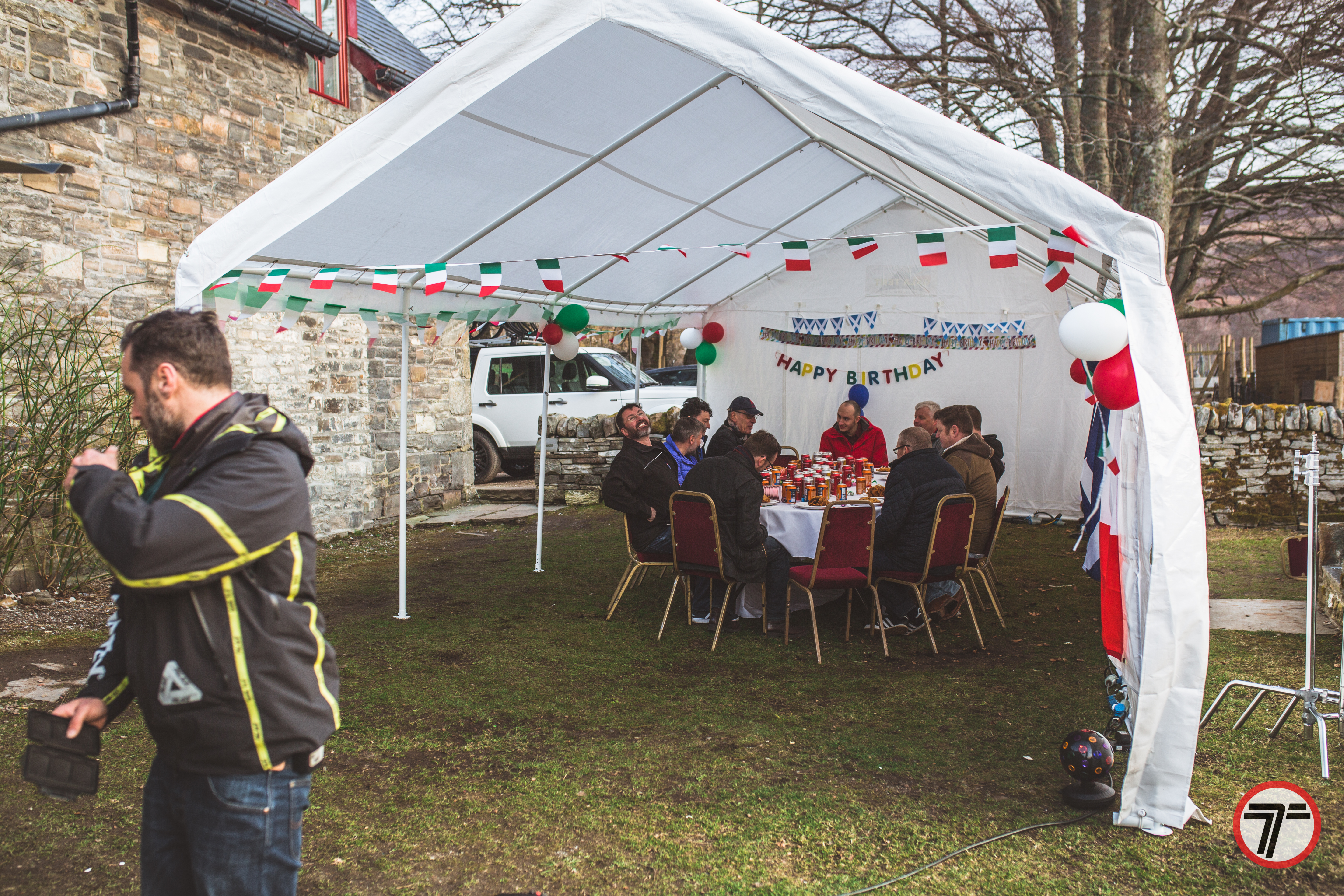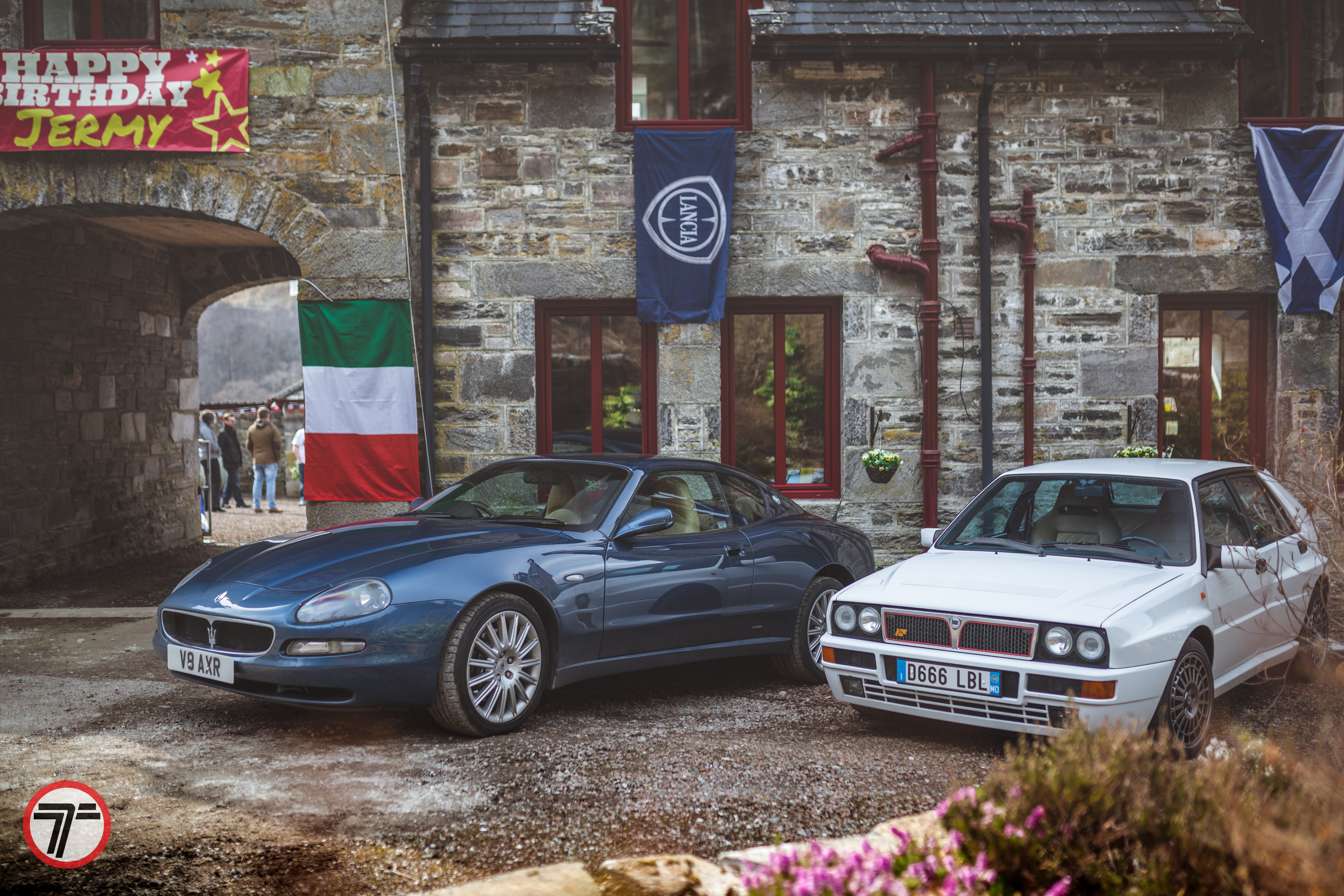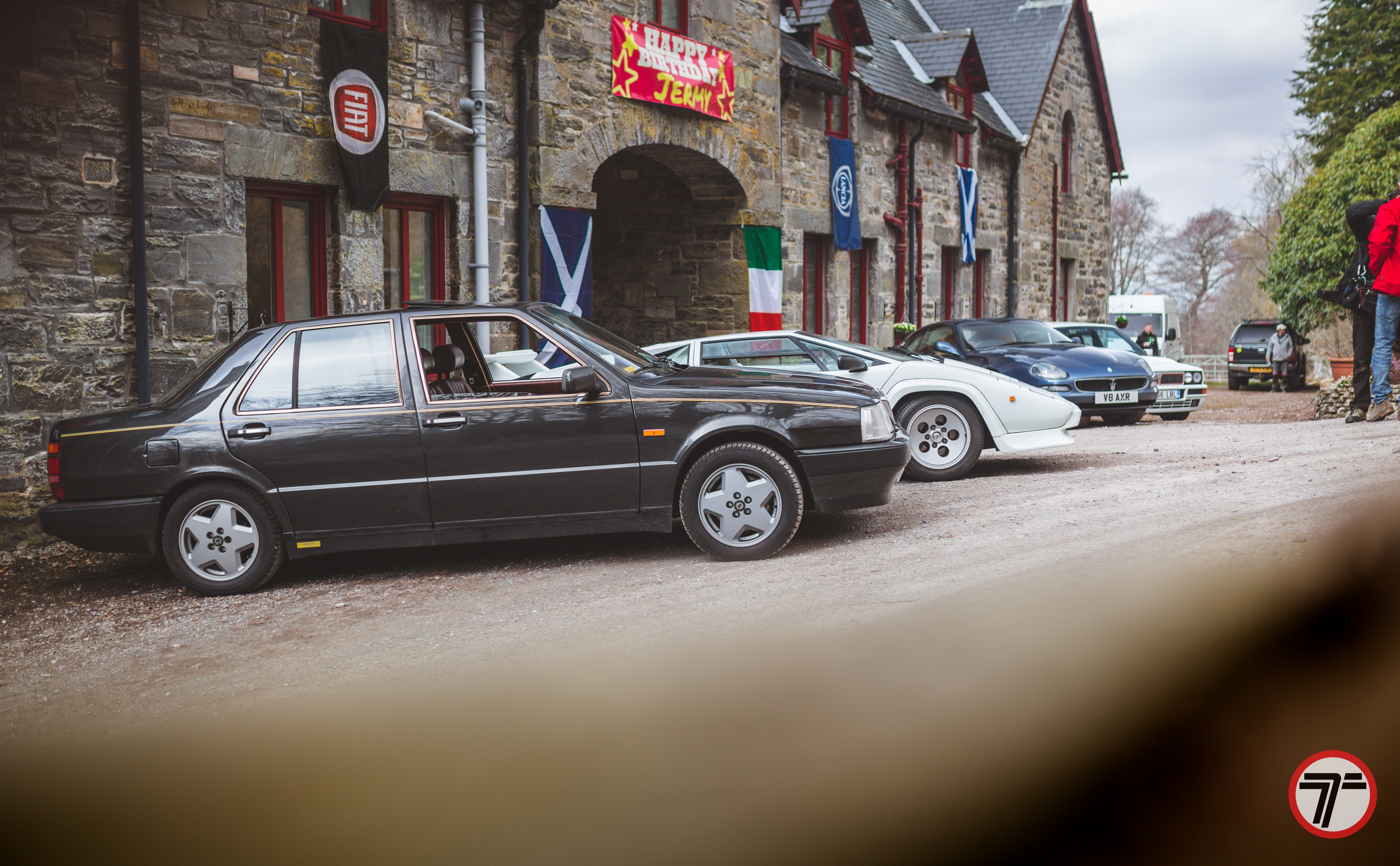 But time was marching on and we had to get to a location outside Ullapool for filming a birthday party for none other than Jeremy, or Jermy as the signs said in true Grand Tour fashion. However it was a convoy of Italian cars after all, and in true fashion there had to be a mechanical. Paul Santoniβs Countach developed a misfire, but regardless it soldiered on and made it there.